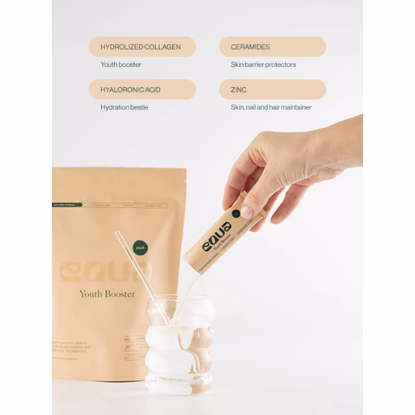 Youth Booster je kolagenski napitek s ceramidi, ki pomaga zmanjšati gube, izboljšati elastičnost in navlažiti kožo od znotraj — da se boš znova počutila samozavestno v svoji koži.