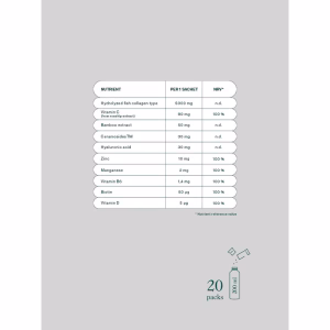 - 5000 mg – CHidroliziran Ribji Kolagen: Obnavlja strukturo kože in njeno elastičnost.