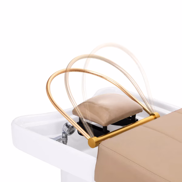 Umivalna enota je opremljena z mešalno armaturo, ki omogoča enostavno prilagajanje temperature glede na želje stranke. Namensko mesto za ročno prho olajša delo, kromiran odtok s posebnim sitom pa omogoča nadzor pretoka vode ter ohranjanje visokih higienskih standardov v salonu. Priključek za vodo je nameščen znotraj podstavka, kar omogoča učinkovito skritje vseh cevi. Ležišče je ergonomsko oblikovano tako, da zagotavlja udobje med različnimi tretmaji. Kombinacija funkcionalnosti in dodatkov naredi delo v frizerskem salonu ali SPA še bolj udobno. Set vključuje tudi udoben puf stolček, ki zagotavlja udobje za osebje, zaradi česar je umivalno ležišče še bolj vsestranska rešitev za SPA salone.