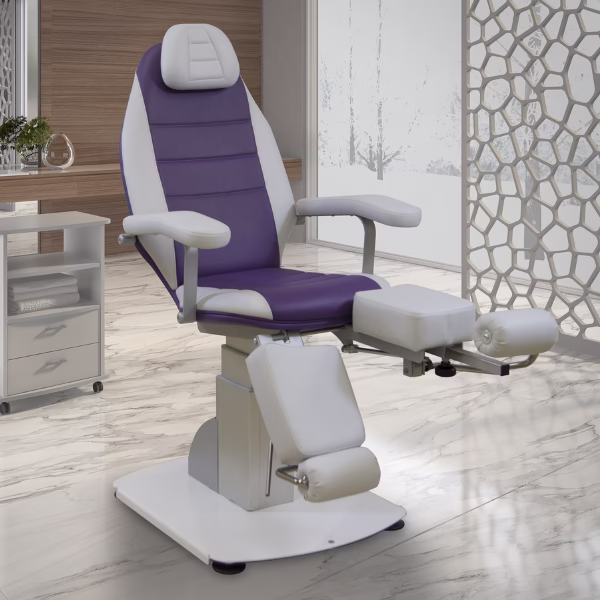 Podiatrični stol opremljen z pedalnim daljinskim upravljalnikom in s teleskopsko oporo za glavo ter oblazinjenimi nasloni za roke. Opcijsko je možno dodati tudi posodice za manikuro.