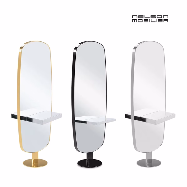 Otočna frizerska postaja za 2 delovni mesti z ogledalom in okvirjem iz vinilne smole v polirani srebrni, črni ali zlati izvedbi ter polirano inox polico in kovinskim podstavkom.