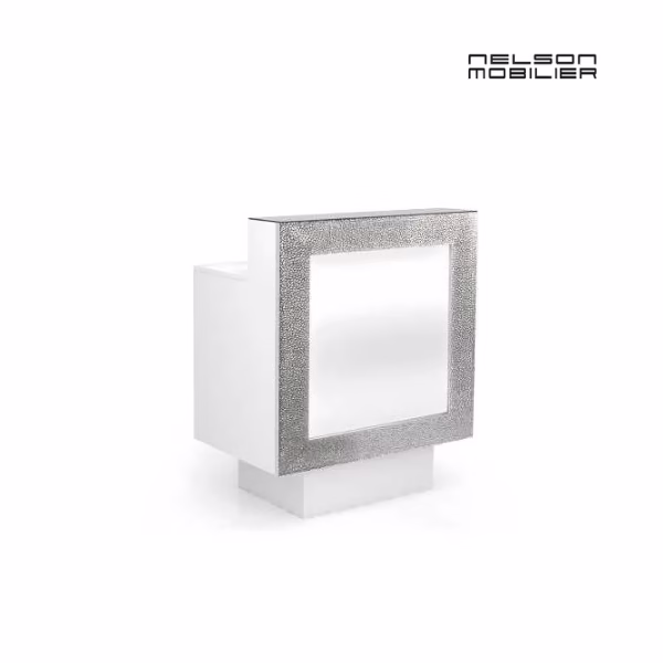 Recepcijska miza z zadnjim delom v belem laminatu, ref. Blanc Luxe T31, sprednjim delom z okvirjem iz oblikovanega PVC-ja z lakiranim srebrnim zaključkom, osvetljenim sredinskim delom iz belega pleksi stekla in pultom iz stekla.